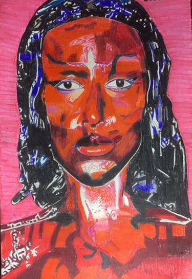 This art piece showcases how masculine and feminine aspects blend well together. The masculine demonstrates strength while the feminine enhances the beauty found within. I honor this women in the photo as she put her people first and chose to fight for her country.Her boldness from her effort is what makes her beautfiul.