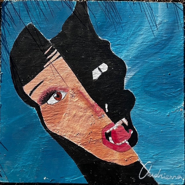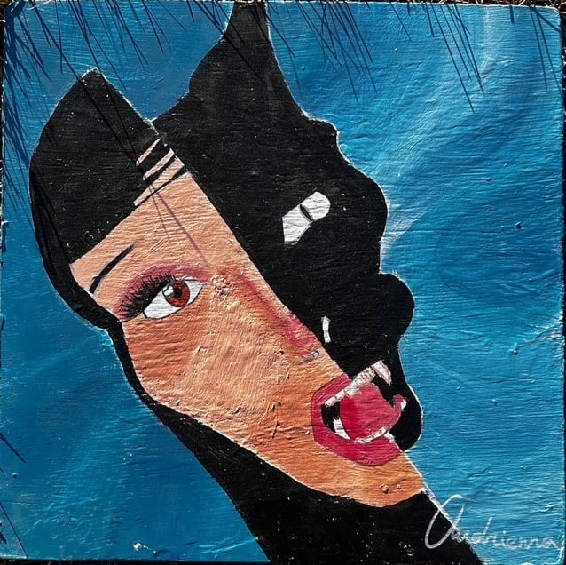 This painting shows the aspects I see in myself from the black cat. I am seen as somebody that is mysterious and independent. I am outgoing but If you cross boundaries, I will attack like the black cat. The teal reflects the emotional healing I have done, Once I was an out of control cat and now I am calm black cat.